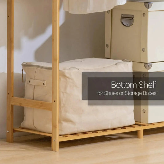 Bamboo Clothes Rack with Double Rods and Storage Shelves Free Standing Open Wardrobe Rack for Hanging Clothes and Storage for Be