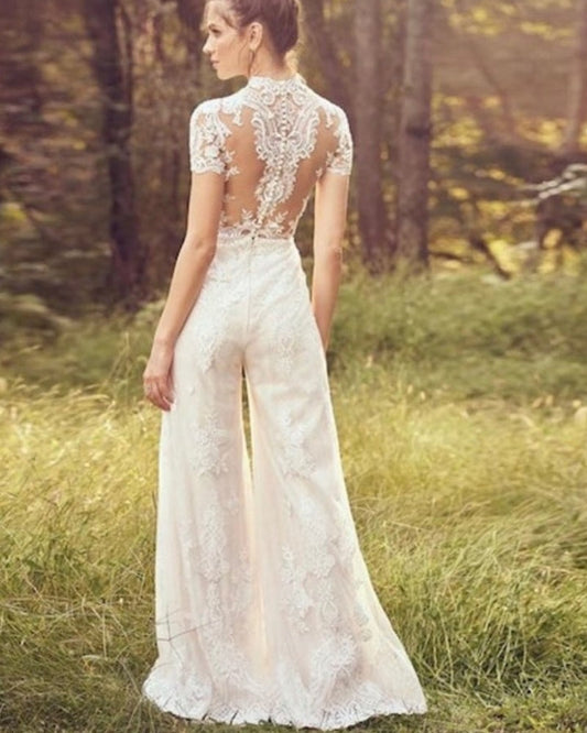 Bride Pants Suit Wedding Bridal Gowns Short Sleeve Jumpsuit