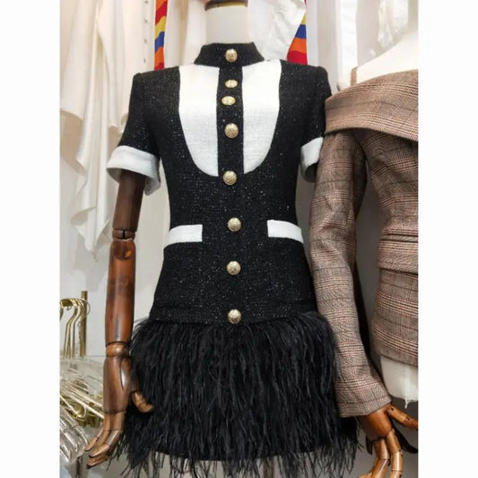 Normaler Preis HK$622.00Normaler PreisGrundpreis / proVerkaufspreis HK$622.00Europa und die Vereinigten Staaten Herbst Winter Sterne Damenmode Metallschnalle schwarz und weiß Clash-Farbe Saum Nähte Federkleid
