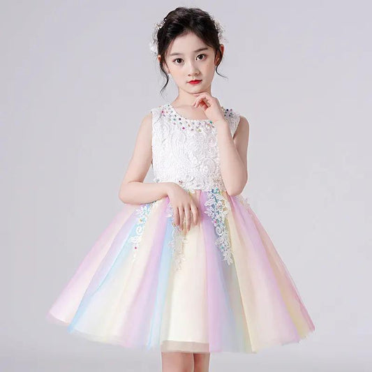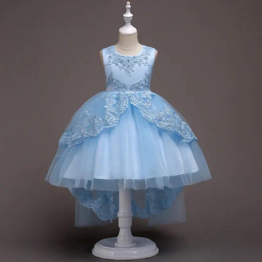 Elegantes weißes Blumenmädchenkleid mit aufwendiger Spitze und High-Low-Saum.