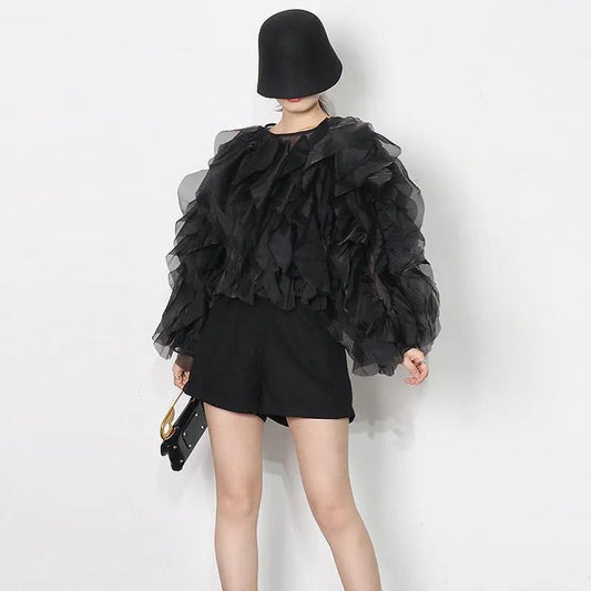 Europa und die Vereinigten Staaten mode frauen hemd frühling und herbst neue design gefühl rüschen nähte einfarbig rundhals net rot hemd