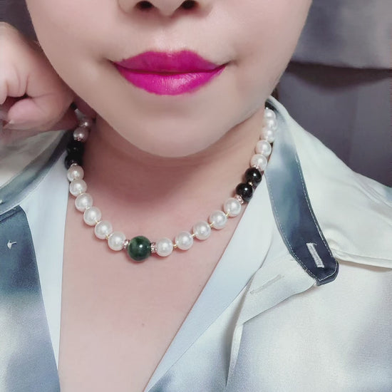 Hand-selected 8–10mm lustrous freshwater pearls flow into rare gold-sheened obsidian, crowned with a vivid ice-jadeite jade sphere that radiates prosperity and calm. Rose-gold plated filigree clasp and individually knotted silk thread complete this one-of-a-kind creation.
